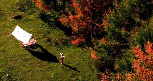 原生态的高山牧场,没有人工打造的痕迹,山谷间是一片开阔的谷底,小溪从中间流过,秋日的狮子沟,一片落叶松林,加上周边彩林,一片多彩的童话世界。